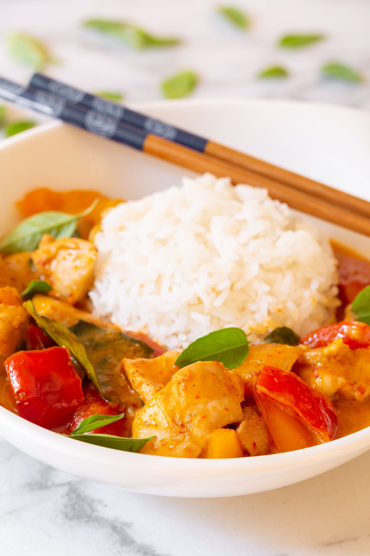Panang Curry is enticingly aromatic and utterly delicious. The dish gets its unique flavor and aroma from kaffir lime leaves, fish sauce, and Panang curry paste. Roasted peanuts are ground into the curry paste and peanut butter is added separately to really bring home the mellow, nutty flavor in this dish. Coconut milk adds thickness and creaminess to the curry, while chicken thighs, onions, and bell peppers add bulk and bite to this Thai classic. Whether you are a fan of Thai curries or a complete newbie, we highly recommend making this Thai recipe in your own kitchen. Bonus? The whole thing comes together in just over 30 minutes! Read to learn how to make Panang Curry at home?