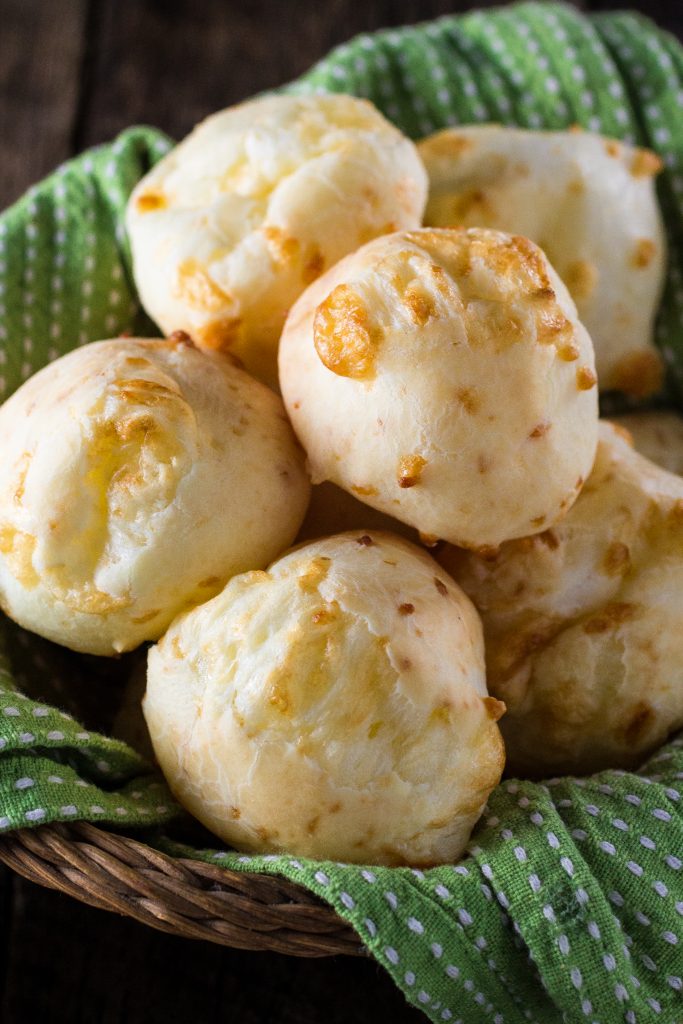 Pão de Queijo, or Brazilian cheese bread, is soft, gooey, warm, and – of course – super cheesy! The origins of this popular Brazilian snack food are a little unclear, but it’s thought that Pão de Queijo was created during the slavery period in the 18th century, most likely in the “fazendas mineiras” (farms located in Minas Gerais). Over time, the cheesy, gooey snack became popular throughout Brazil. Pão de Queijo tastes great on its own, especially fresh out of the oven. But if you have leftovers, feel free to use these cheesy snacks as a sandwich bread substitute! You can also freeze them for a later occasion. Ready to make your own Pão de Queijo at home?