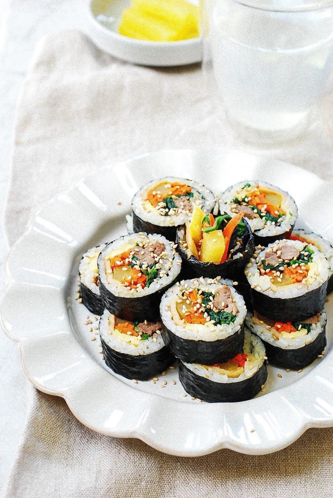 Kimbap is a Korean rice roll that’s wrapped in seaweed and filled with vegetables, sliced egg, and meat. While there are many variations, the classic Korean kimbap fillings are: yellow pickled radish (danmuji), eomuk (fish cake), burdock root, carrots, spinach, eggs, and beef. Each ingredient is cooked individually, but when they’re rolled together in the kimbap, they create an irresistible mix of textures and flavors. The rice used to make kimbap is lightly seasoned with sesame oil for a nutty, savory flavor, and roasted seaweed sheets usually come pre-seasoned with sesame oil, too. Since everything is so well-seasoned, kimbap is usually eaten without any dipping sauce. This makes it a great choice for lunch; in fact, kimbap is the most popular on-the-go meal in South Korea today. While rolling kimbap takes a little practice, it’s a fun process that anyone can learn! Ready to try your hand at this Korean staple?